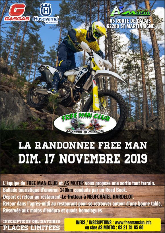 17/11/2019 | La randonnée Free Man Ballade enduro L’équipe du FREE MAN CLUB vous propose une sortie tout terrain le 17 Novembre 2019. Cette ballade d’environ 140km prendra départ au restaurant Le Trotteur (2 rue des Écoles, 62152 NEUFCHÂTEL HARDELOT). Cette journée qui se veut touristique sera conduite par un Road Book. Retour dans l’après-midi au restaurant Le Trotteur pour se retrouver autour d’une bonne table. Places limitées ! | Quads & Motos |
